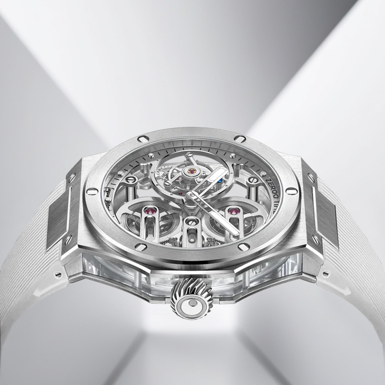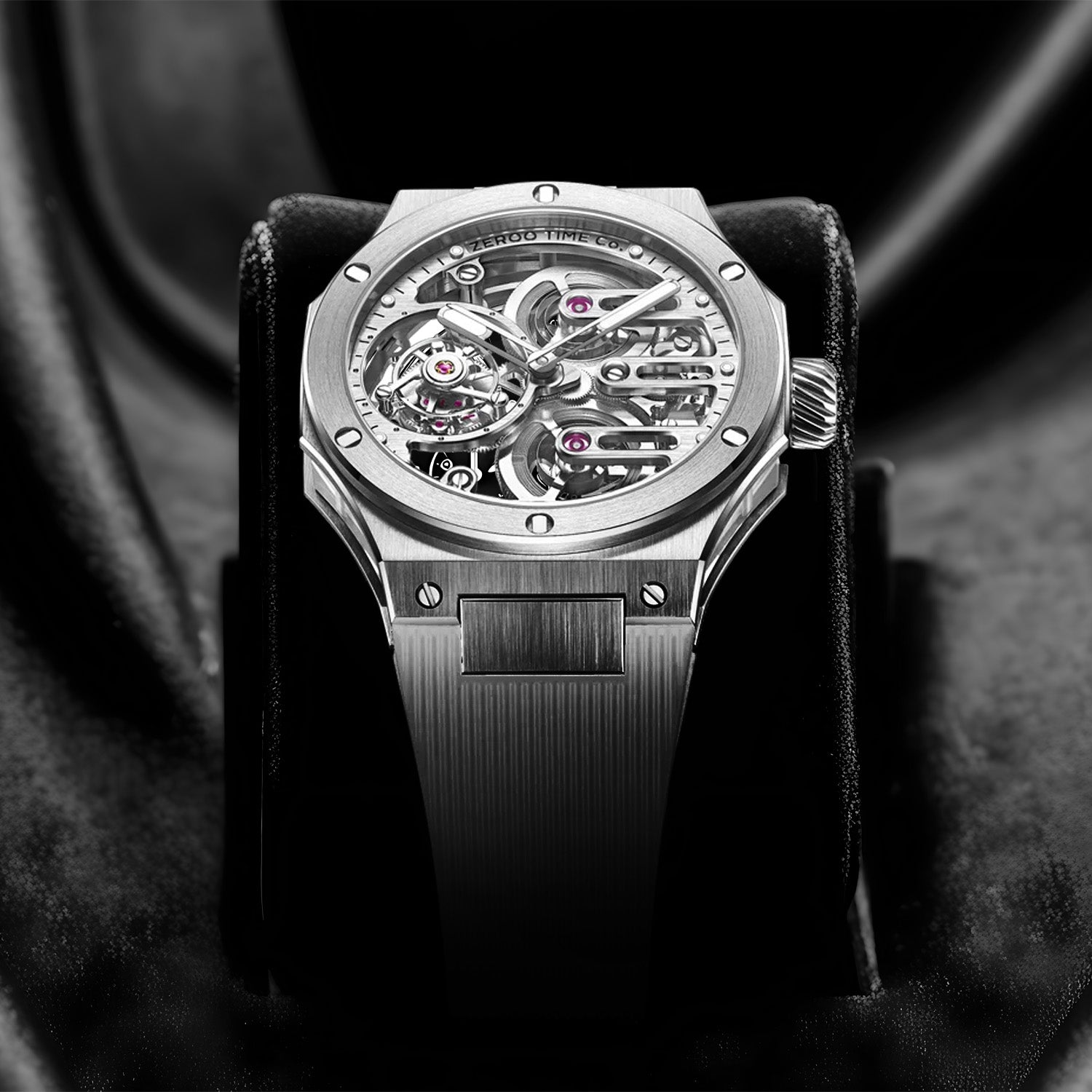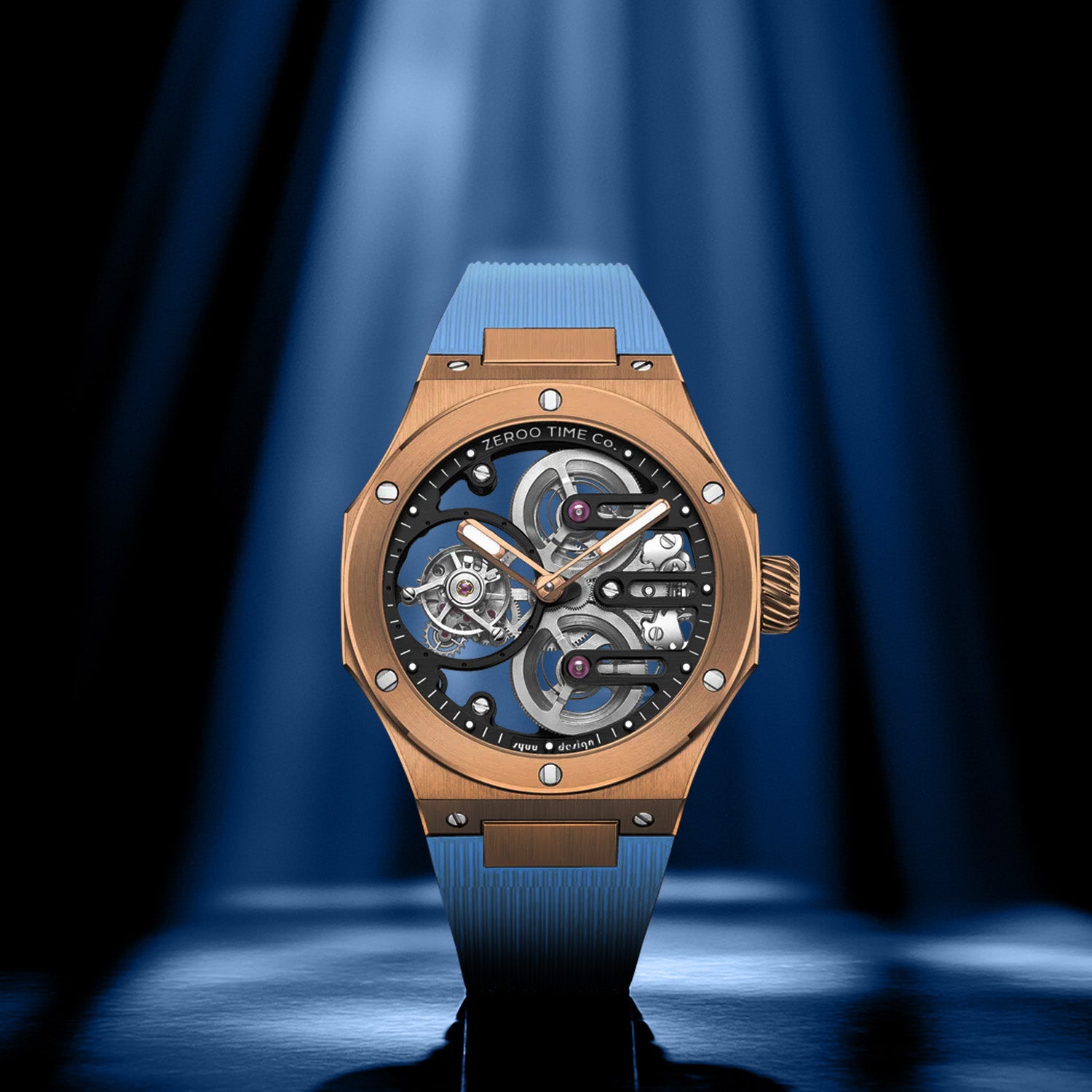 The T8 is Zeroo's first octagonal-shaped watch. Fully skeletonized to allow the tourbillon to be appreciated to the fullest.