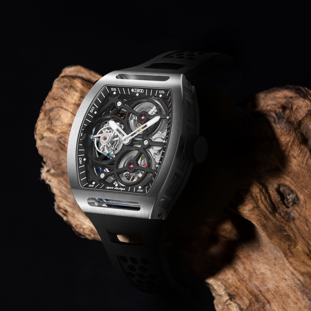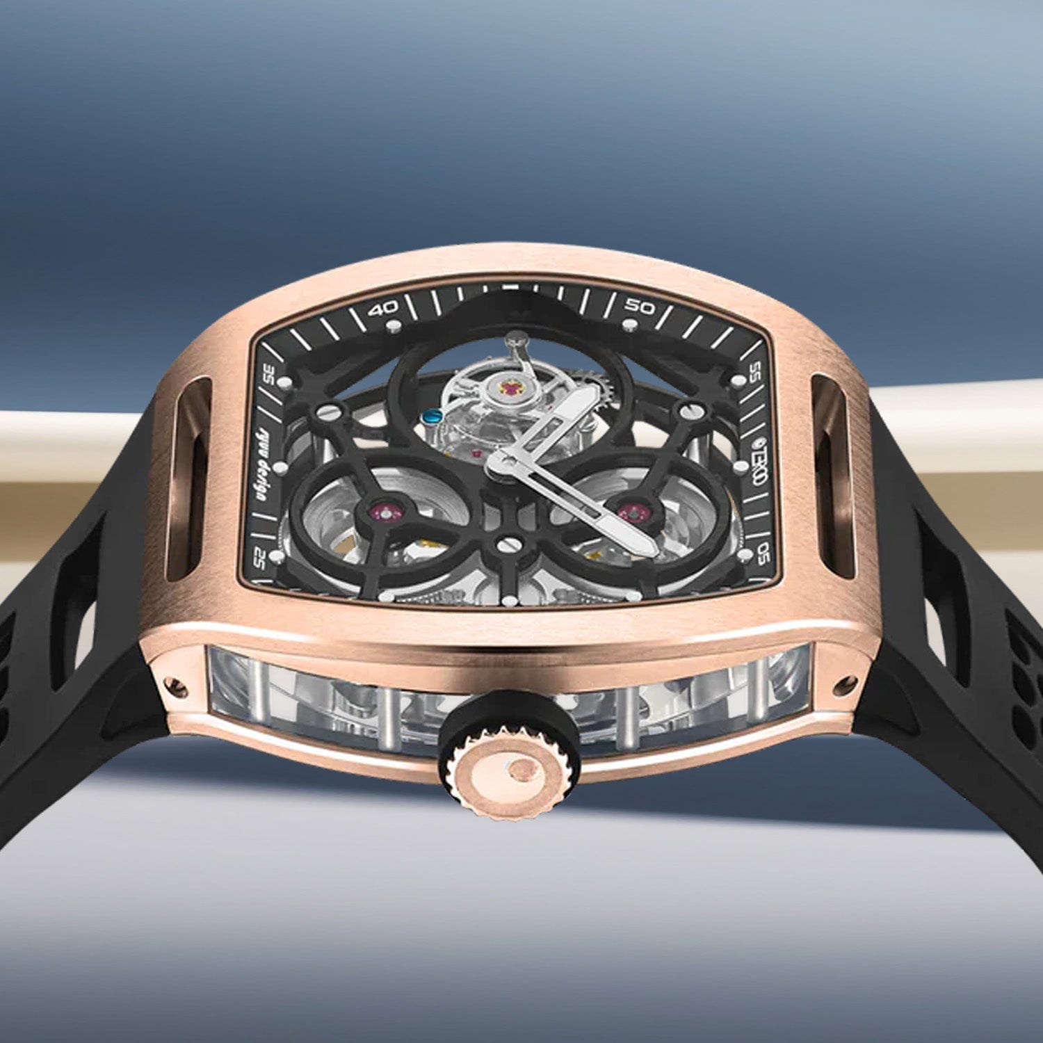 Is a limited edition model up to 1000 pieces of each color. This fully skeletonised tonneau-shaped tourbillon is designed to be transparent, allowing the wearer to admire the precision of the flying tourbillon movement not only from the front and back but also from the sides.